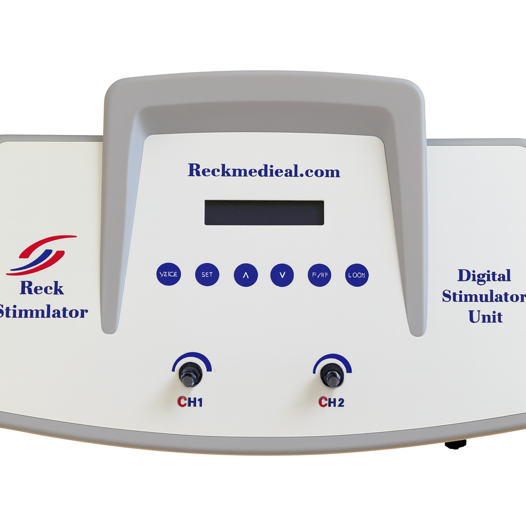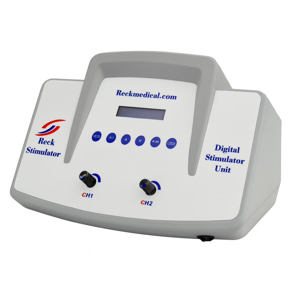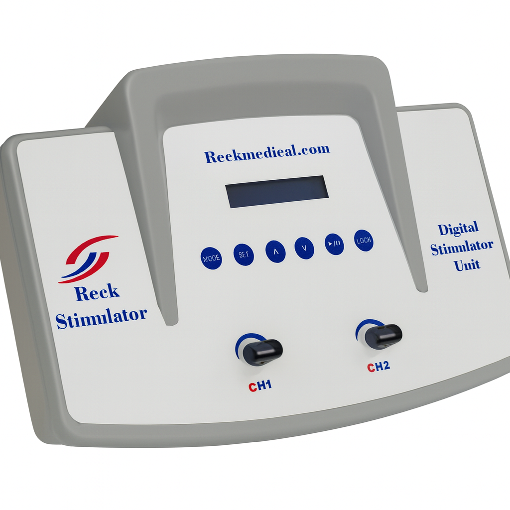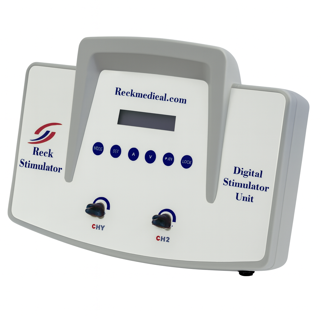 دستگاه فیزیوتراپی دیجیتالی 2 کاناله رک (RECK) با 61 برنامه درمانی مختلف (دستگاه استیمولاتور RECK) برای فیزیوتراپی خانگی آسان و کارآمد طراحی شده است.